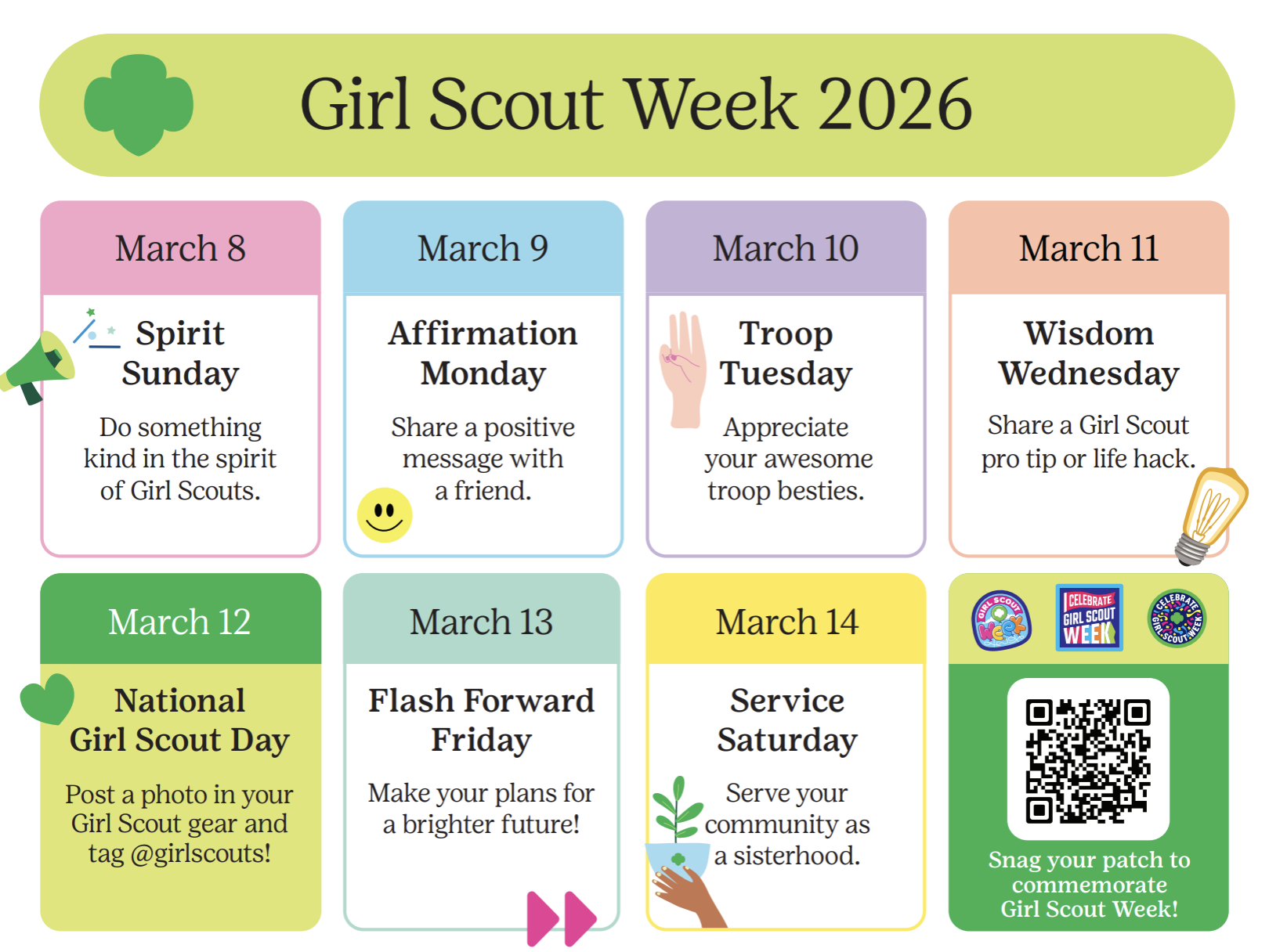 In 2026, Girl Scout Week will run from March 8-14. Come join the fun each day as we celebrate our global sisterhood. Learn more about celebrating Girl Scout week here!